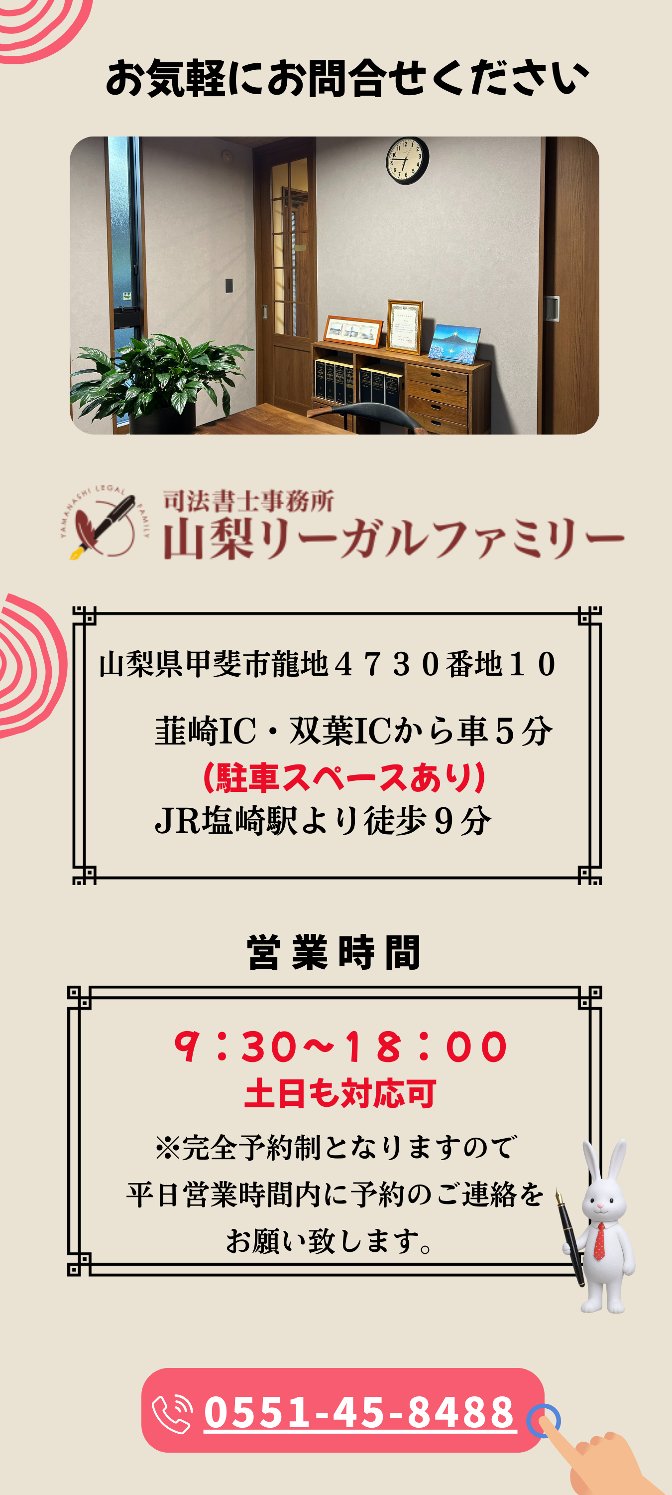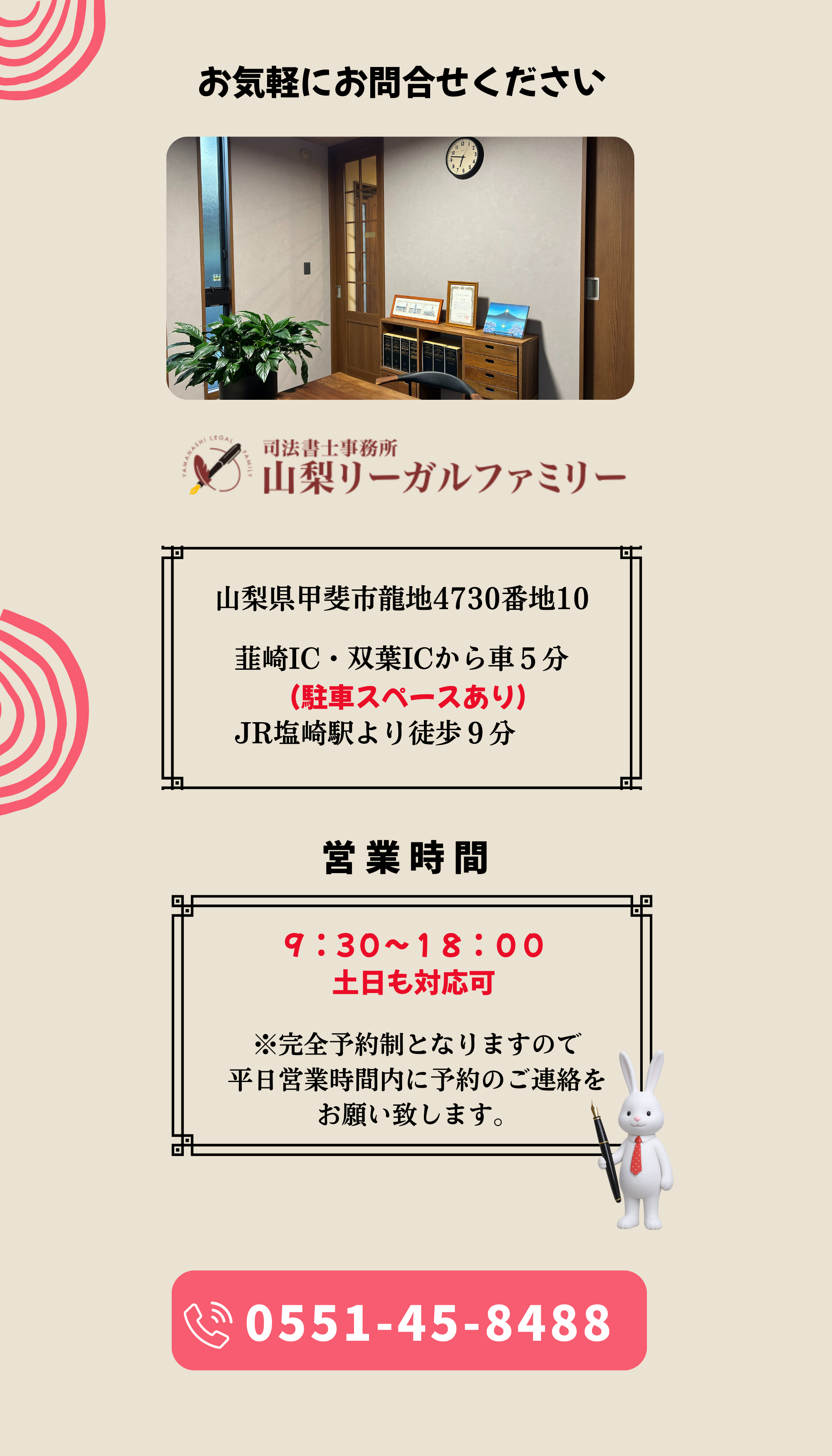 | 運 営 | 司法書士事務所 山梨リーガルファミリー 司法書士 鈴木梨紗 |